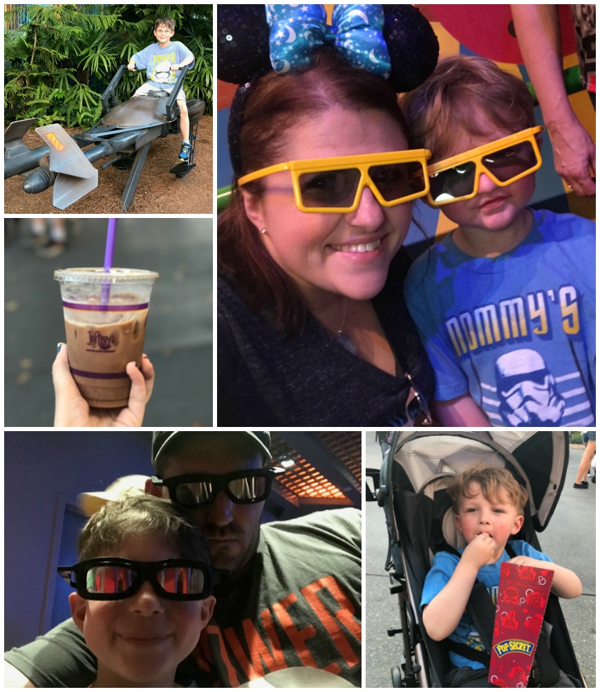 We had a little bit of time before our family dinner, so we made sure to utilize our time wisely. We decided to head straight to Toy Story Mania — a family favorite. Next, I grabbed a coffee from Joffrey’s. I love the “DVC Special.” If you’re a Disney Vacation Club Member, make sure you ask for it! Also? Did you know if you’re a Disney Visa Cardholder you can receive 20% off your purchase at Joffrey’s? I love to save!! Avery needed his popcorn fix. And finally, we headed to Star Tours for Lincoln and Jared.