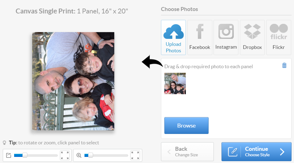 One of my favorite features from Canvas Factory, is the ability to upload your photo from Facebook, Instagram, Dropbox, or Flickr. I recently purchased a new laptop, and my photos are not on it. They are however all stored on Flickr! This made the process even easier!!