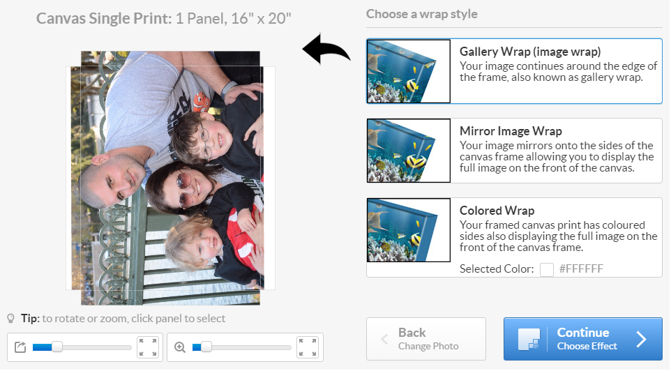 Now it’s time to decide on how you’d like your image to be wrapped around the canvas. I personally prefer the “Gallery Wrap.” This means that your photo simply continues around the edge of the frame.