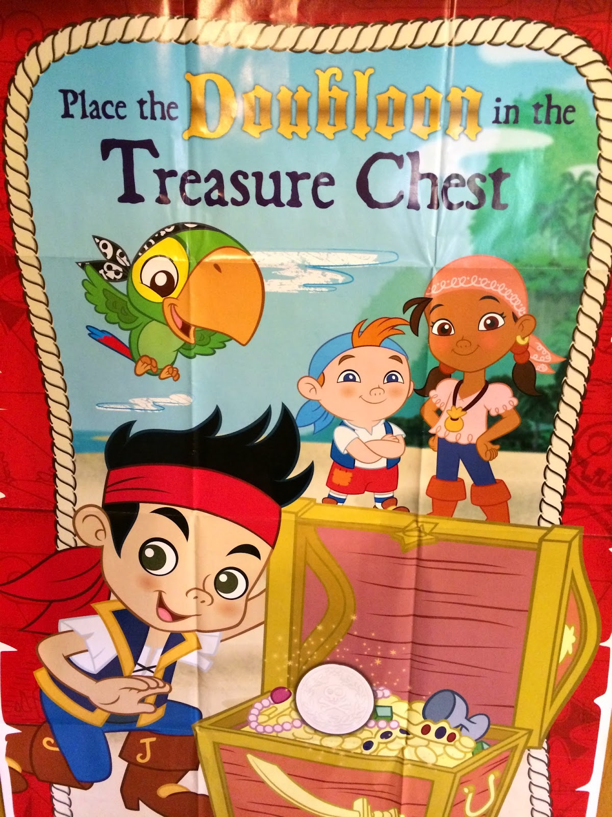 The kids loved playing this little game.They had to place the doubloon  into the treasure chest – blindfolded, of course!!