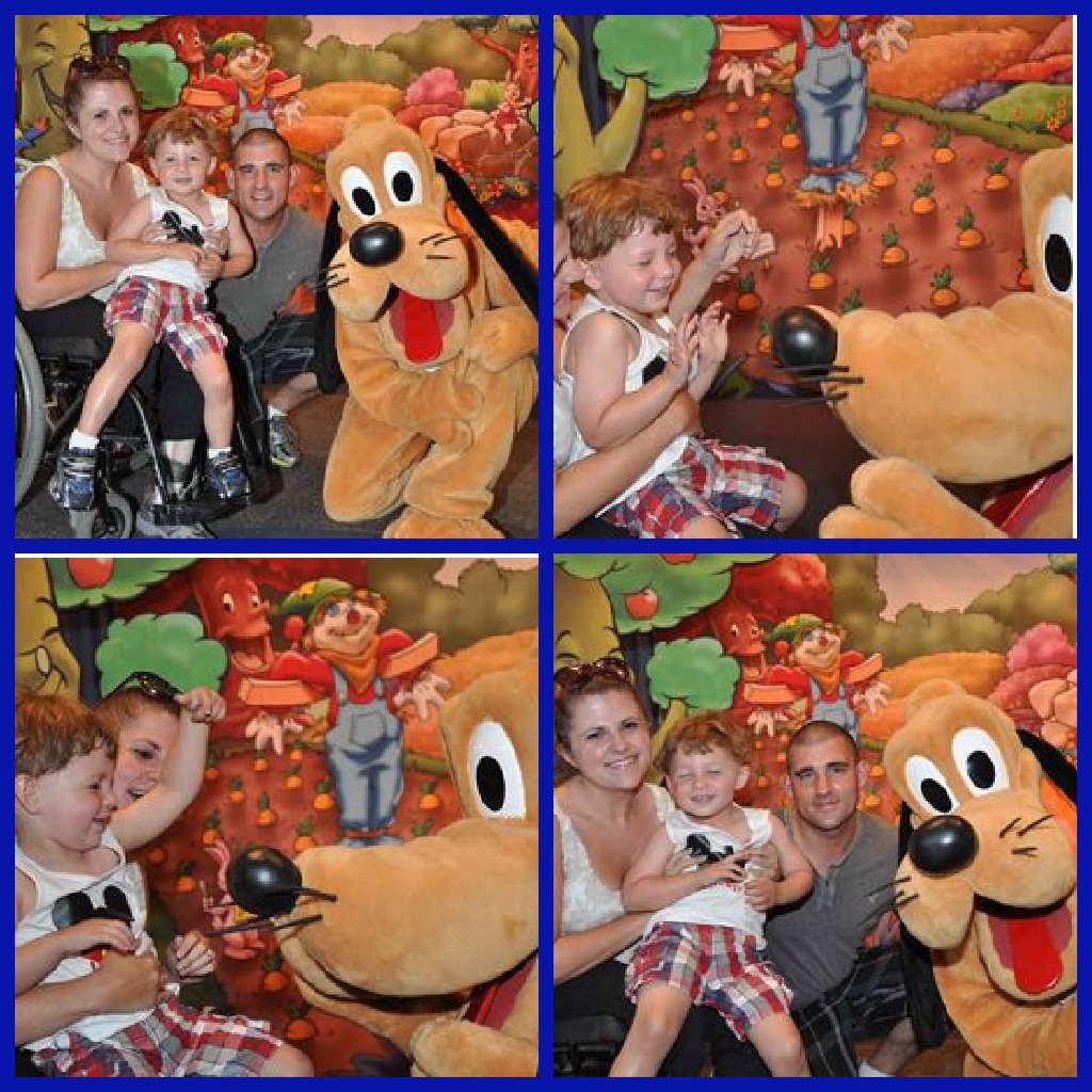 Next up was Mickey’s best pal, Pluto! Pluto is a bit intimidating looking, because he’s so huge. However, he was great with Lincoln and got down to his level. We actually were able to get a few cute family shots with Pluto ๐