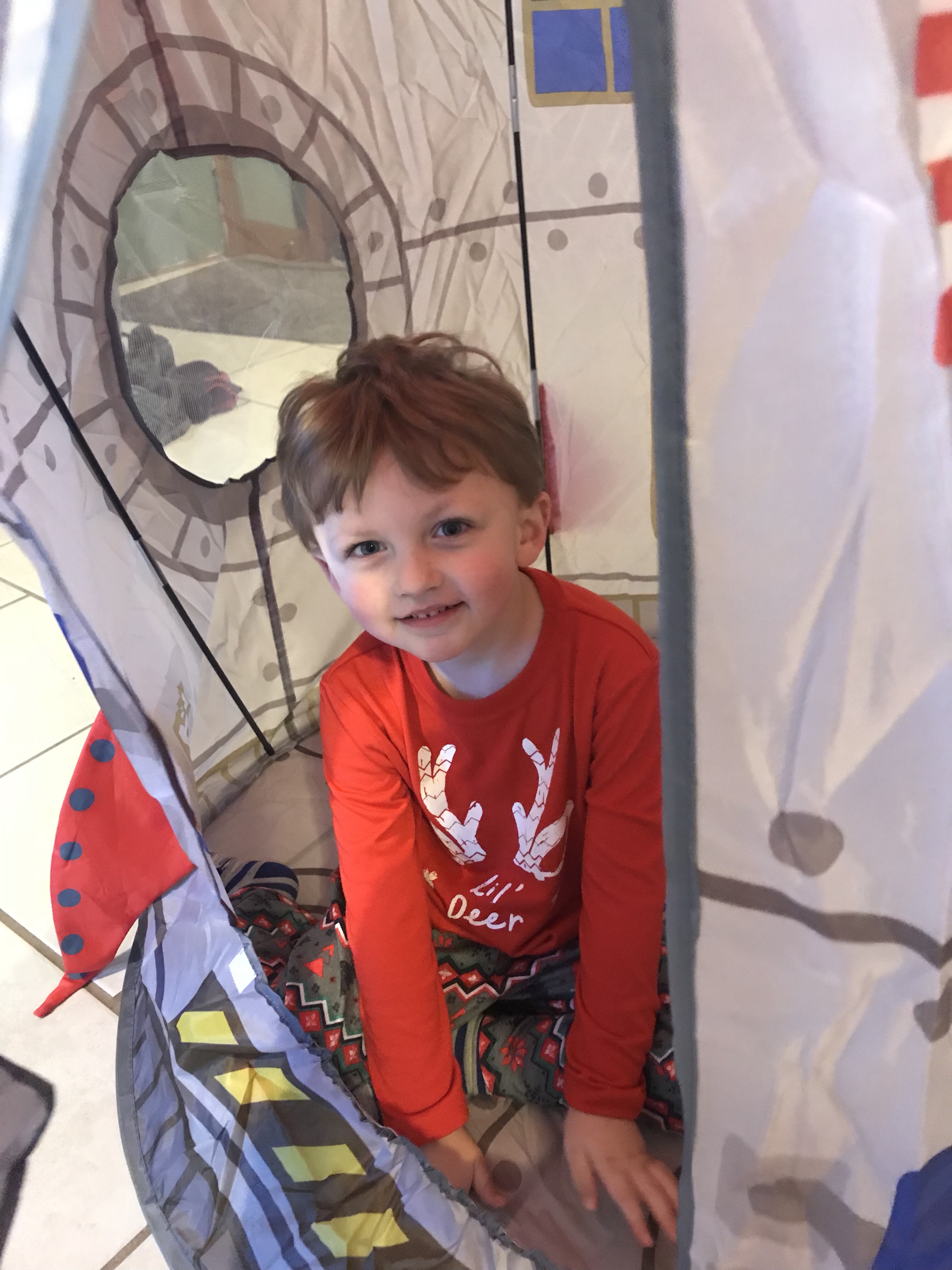 Avery’s spaceship tent was a HUGE hit for Christmas. He plays in it every single day. He even brought his other space toys inside, and a little lantern. He’s so stinkin’ cute!!