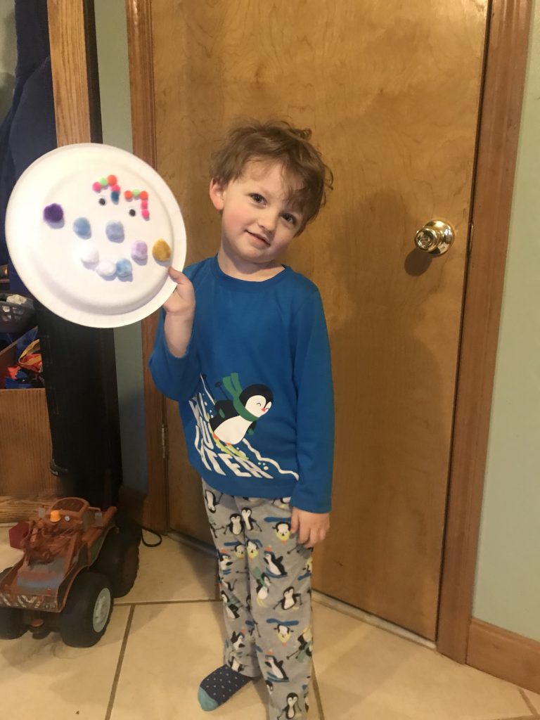 And of course because Lincoln was working on a project, Avery had to too! He made a silly face out of pom poms and glued them onto a paper plate. Afterwards I asked him if his face had a name, and he said, “GRANDMA!!” Way too cute!!
