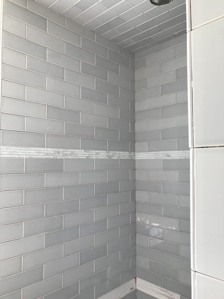 And here’s a little peek of the master bathroom shower! These subway tiles are a very light blue color. I am loving how it’s coming out!