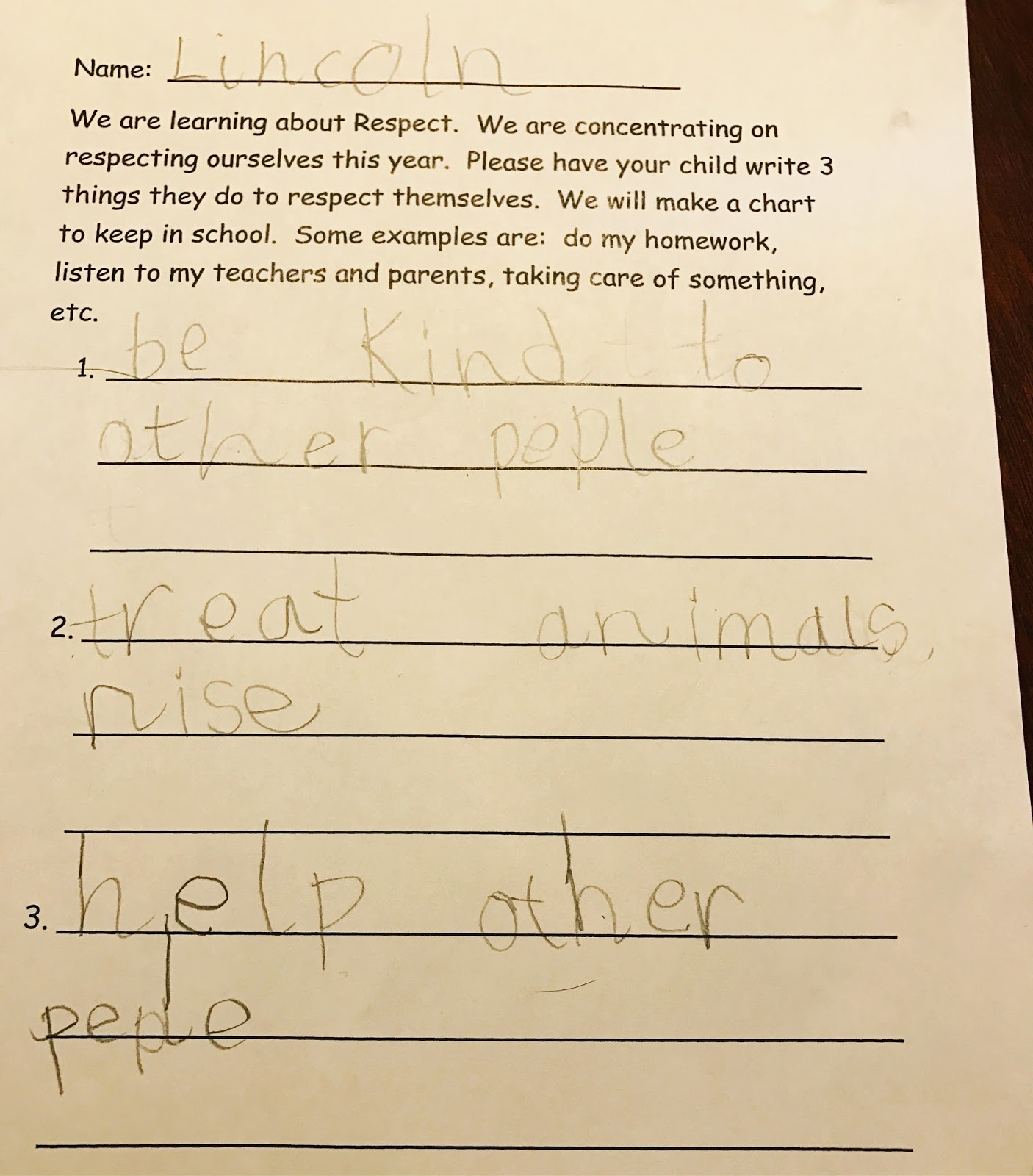 The other day my son came home from school with a homework assignment. His first grade class is learning about Respect. They are focusing on not only respecting others, but respecting themselves as well. His assignment was to write 3 different things he does to respect himself. I read him the examples his teacher provided, but did not prompt him otherwise. He came up with this…