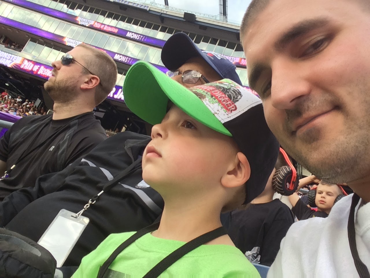 He’s been into all things “monster trucks” lately.  It’s been going on for awhile.  He loves “Gravedigger.”  And they really need a better name for that truck!  Anyways, he’s been asking to go to a “monster truck show” for some time now.   It just so happened that Monster Jam was coming to a stadium near us.  We bought tickets for him to go with Jared, my brother, and Dad.  However, we didn’t tell him about it.  It was a total surprise!
