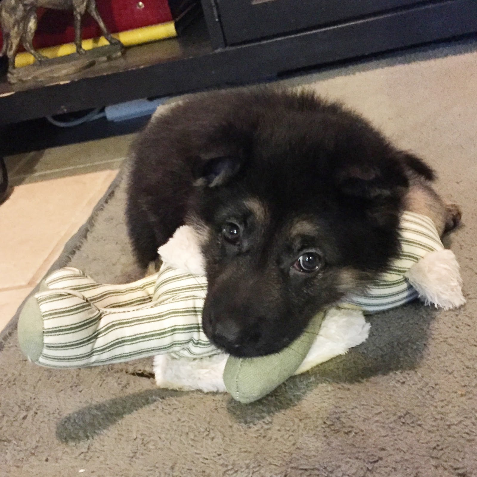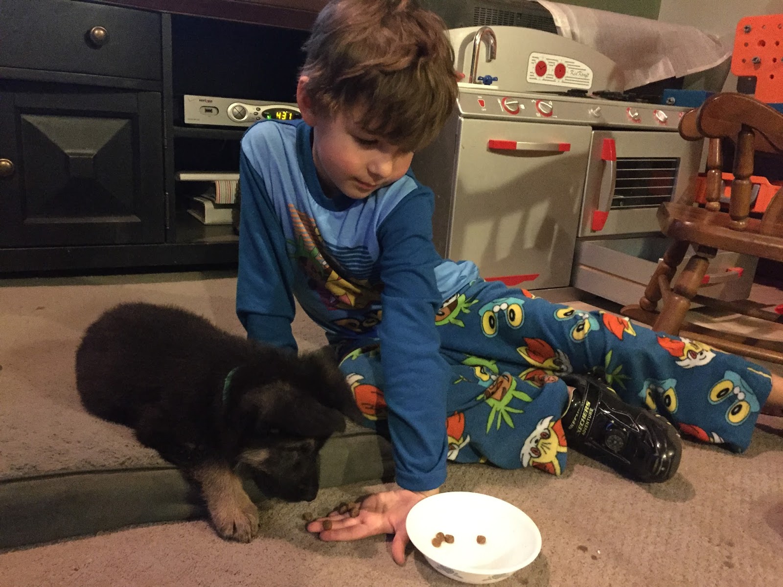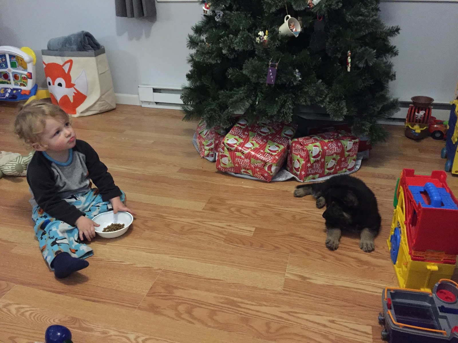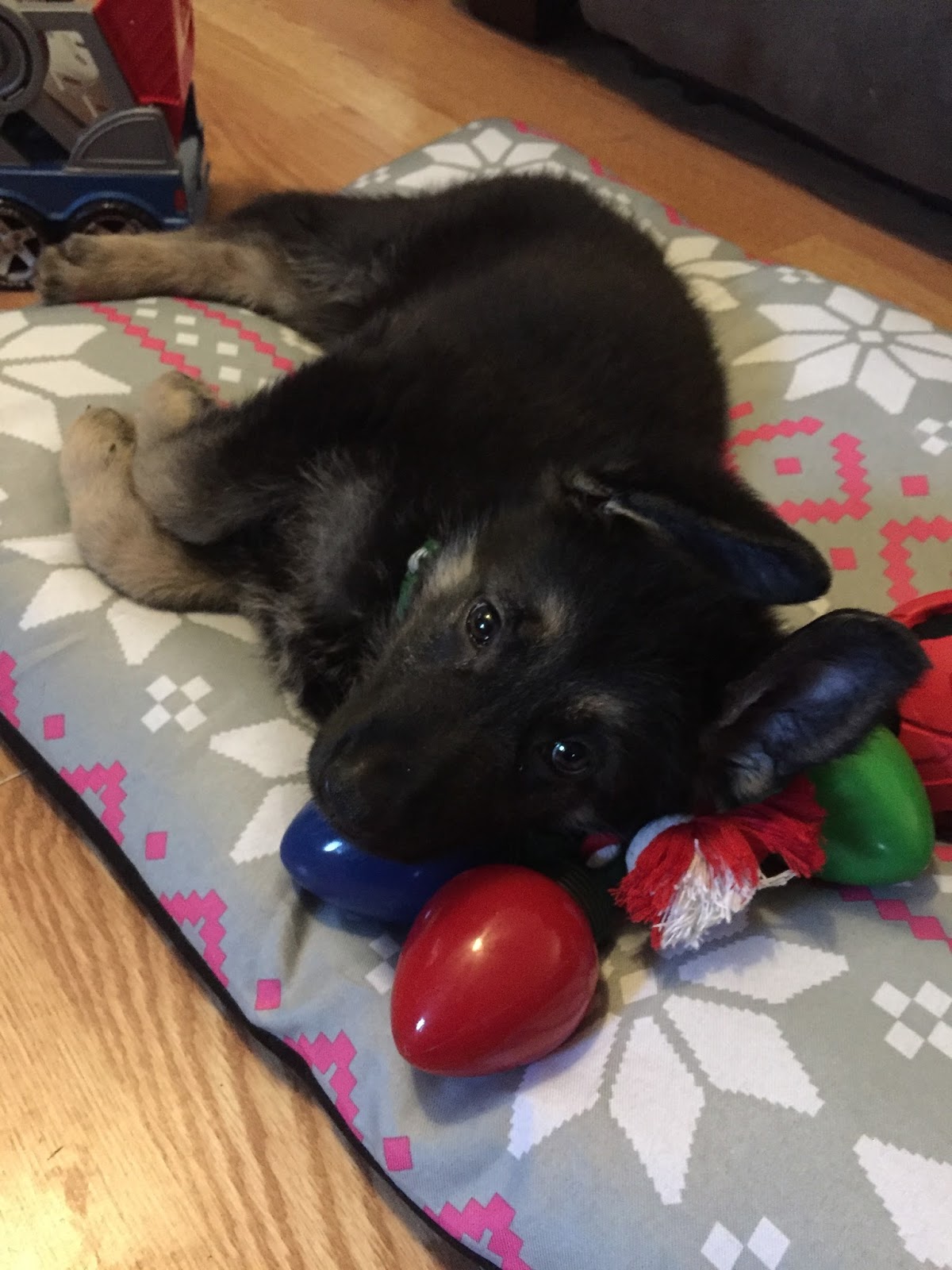My mom happened to know of a litter of shepherds that would available around Christmastime. So of course my mom did what any good Grammy would do…she asked me if she could surprise my boys with a puppy! Jared and I talked it over, and while our lives are still insanely busy, we decided why the heck not?! I have always had dogs growing up, and I want my kids to grow up with dogs. So 3 weeks ago, we picked up our sweet pup!