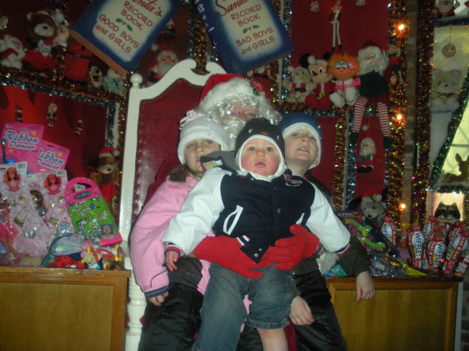 Lincoln loved playing with his big cousins, and they were both so great with him, especially Mallery. On Wednesday we went to this place called “Christmas Village.” It’s basically set up like the North Pole. There’s Santa, Mrs. Claus, reindeer, and a toy shop. It’s really cute. Here are the three kids sitting on Santa…Lincoln looks enormous!