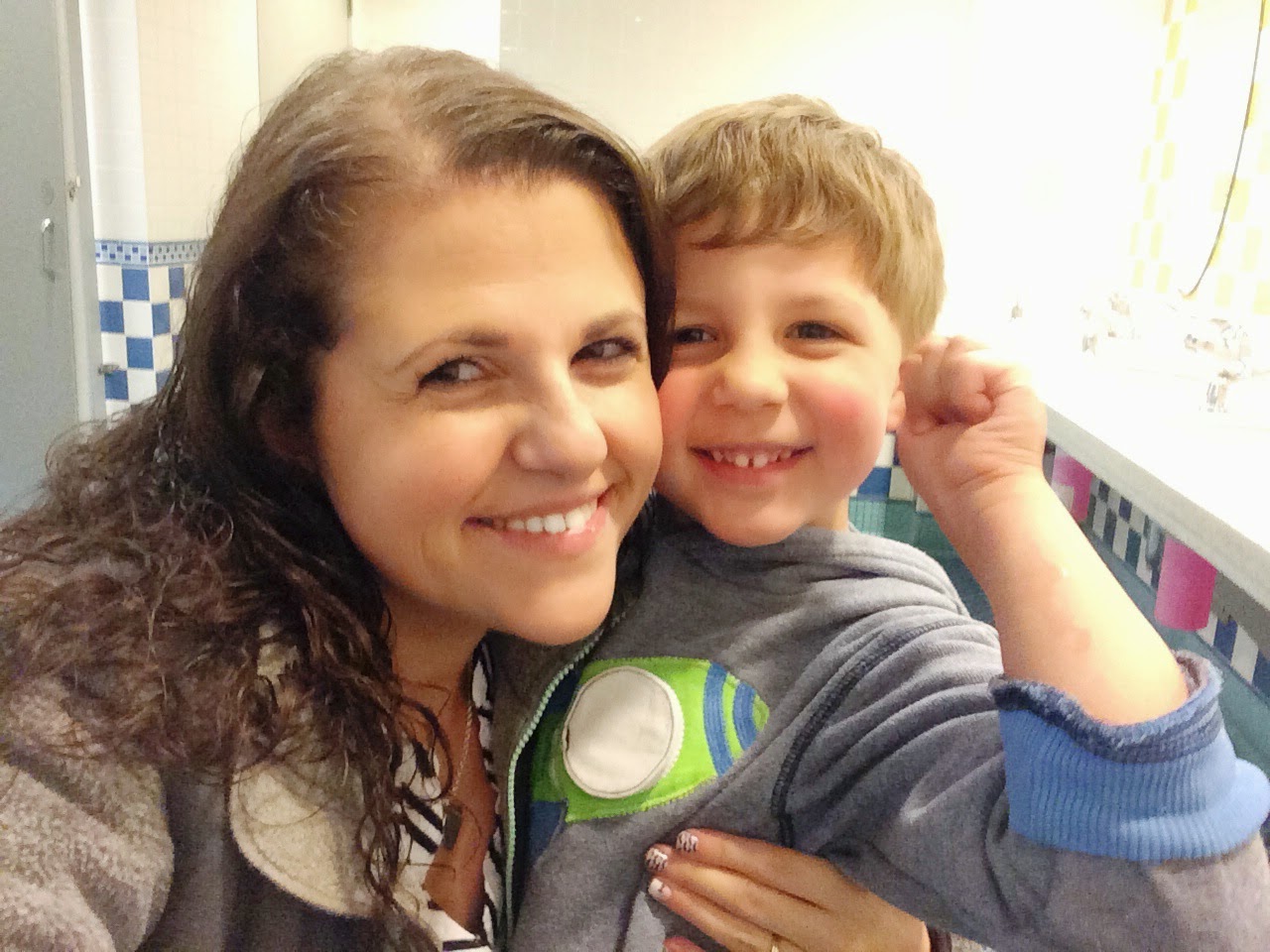 Then it was time to go to the movie!! We were armed with our iced tea and candy!! We took a quick potty break before the show started….and took a little Mommy/Lincoln selfie ๐