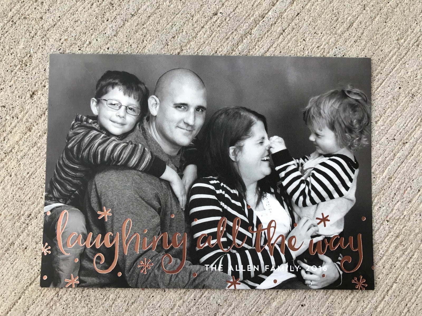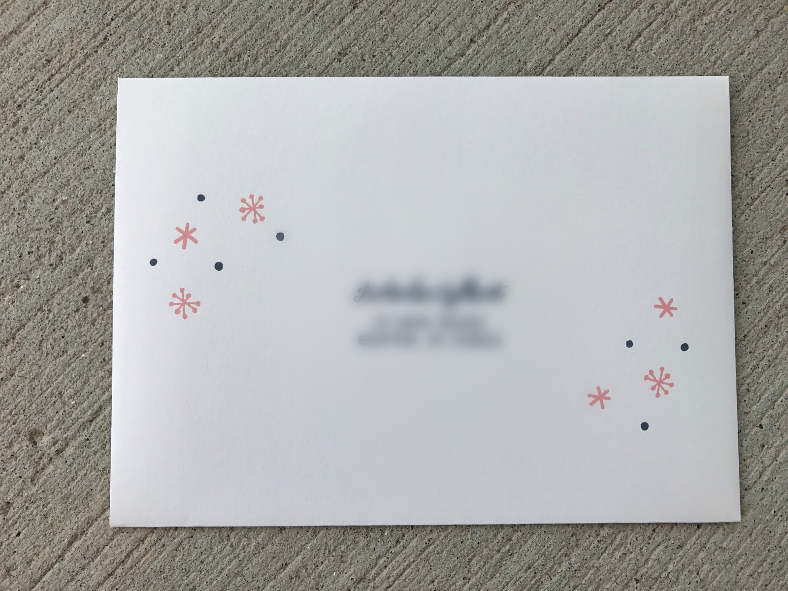 Although I blurred out the address, I want to make note that the font used was beyond gorgeous. I also love how the envelope perfectly coordinated with our rose gold Laughter & Love Foil-Pressed Holiday Card.