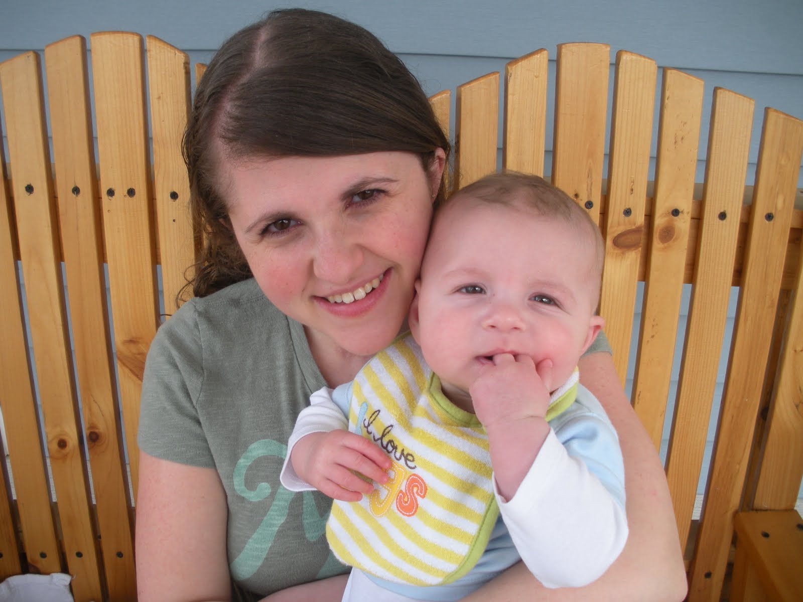 Yup, that’s us. Lincoln LOVES being outside, and lucky for us, his Great Grandfather made us a swing to go on our front porch. It really is a beautiful piece of furniture, and something for Lincoln to always remember him by. We have been having some of our bottles out there (when the weather is nice of course). My sweet boy loves our outside time. I’m thinking once it gets nicer out I can bring him out there in his exersaucer and Momma can [maybe] read a book! Hmm…the thought is at least nice! Anyways, here’s a shot of Momma and her sweet boy ๐