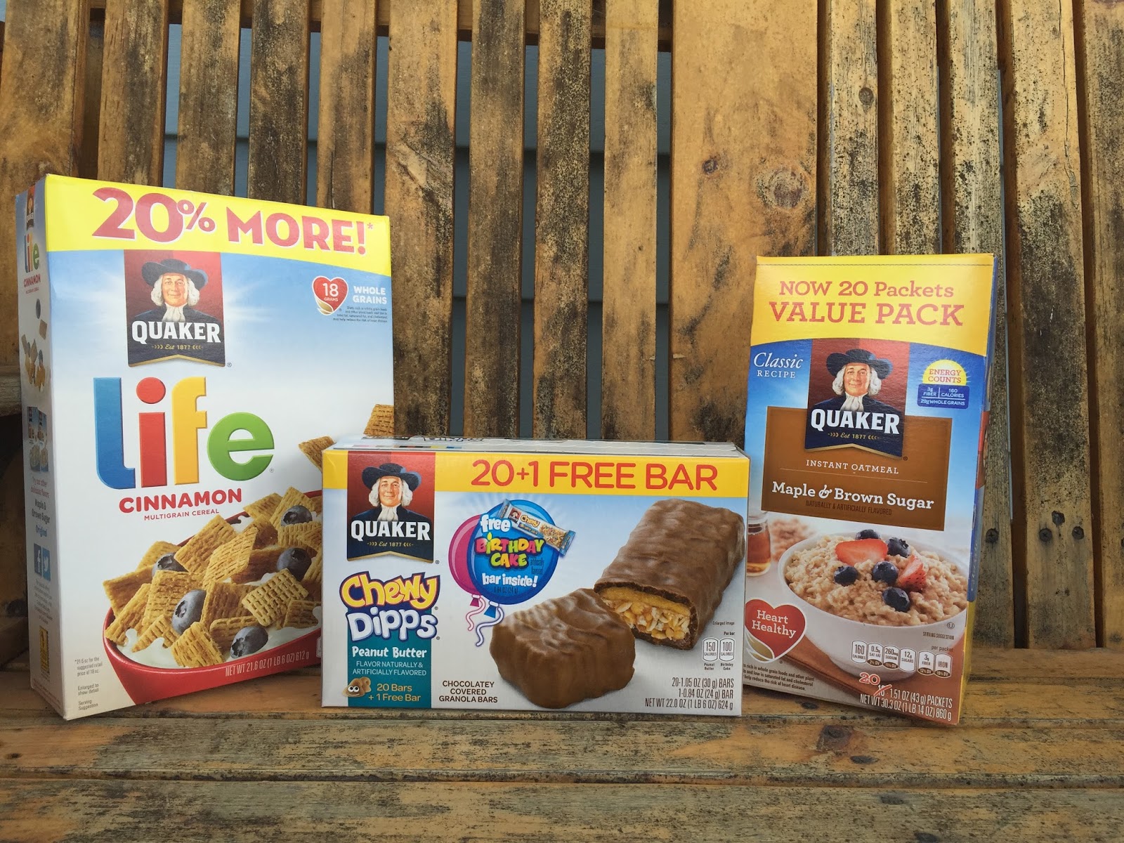 I ended up choosing Quaker Life cereal, Quaker Instant Oatmeal (maple brown sugar flavor, mmm!!), and Quaker Chewy Dips Peanut Butter Bars (which by the way are SUPER yum)!